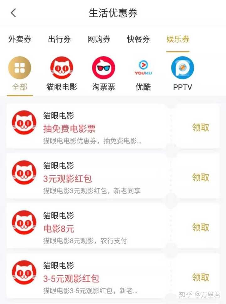 以上这些是平台的生活优惠劵,饿了么、美团、淘票票、优酷、爱奇艺等都可以领取优惠劵它承包了我们生活里的吃喝玩乐购。这款平台涉及范围广,非常全面。值得你去深究,使用!