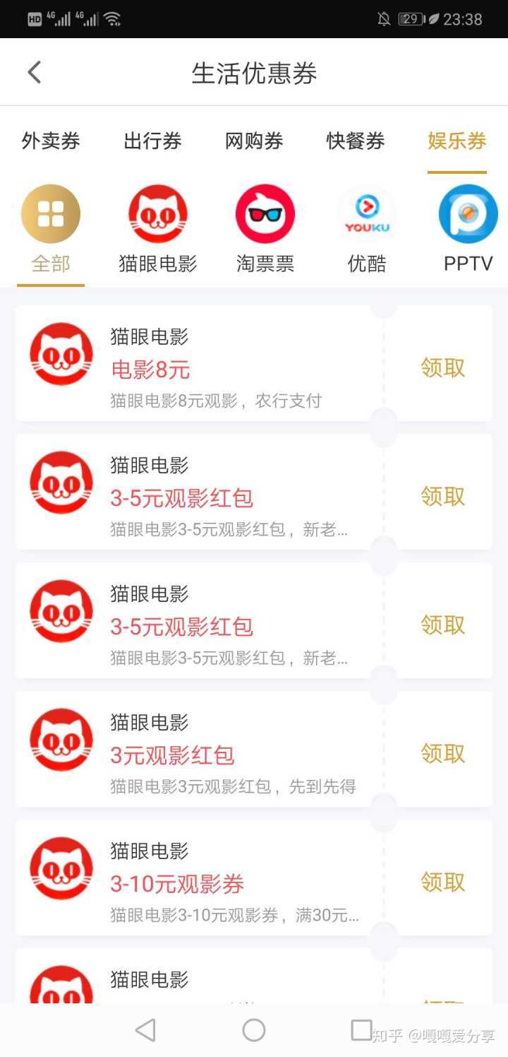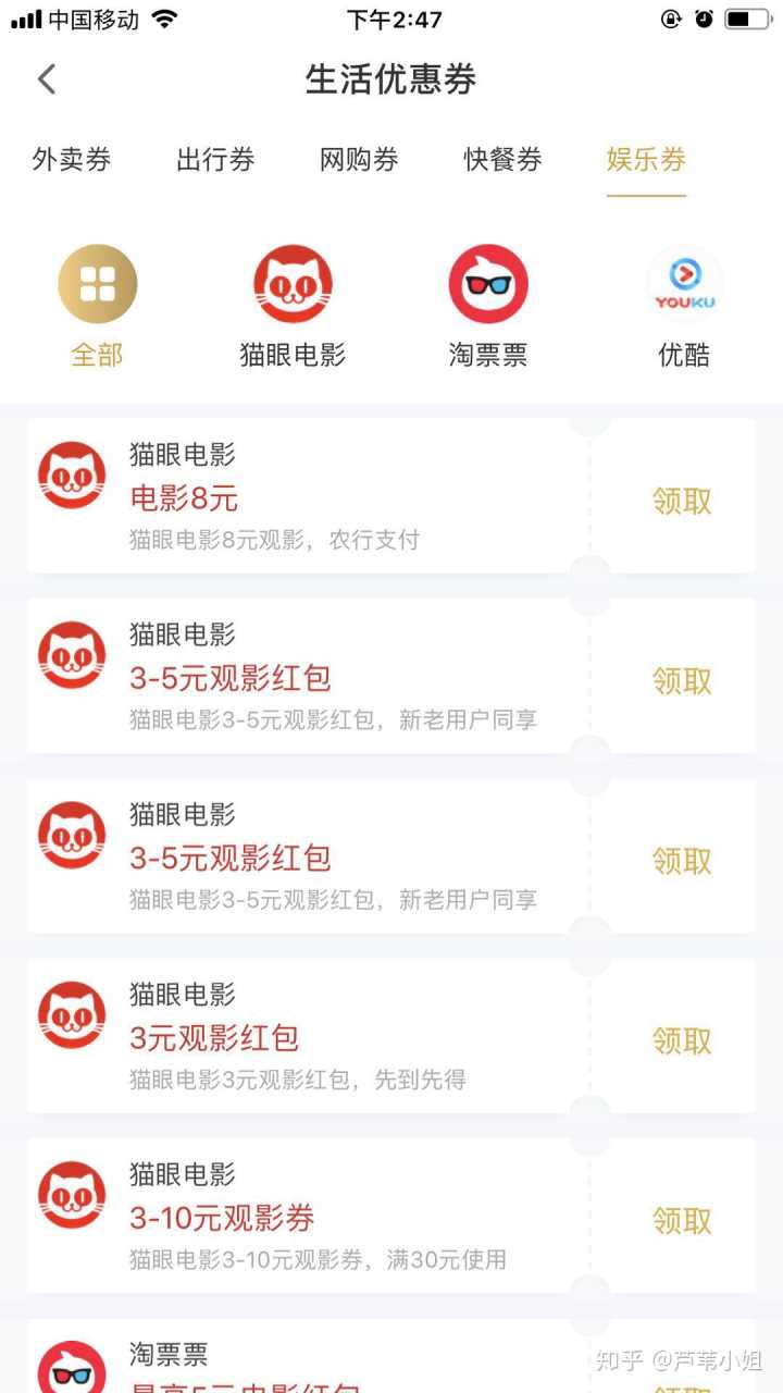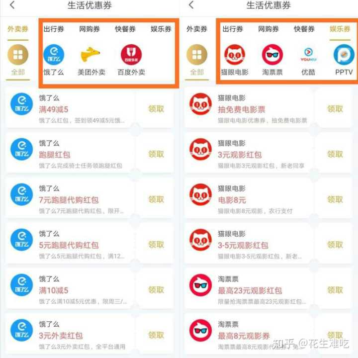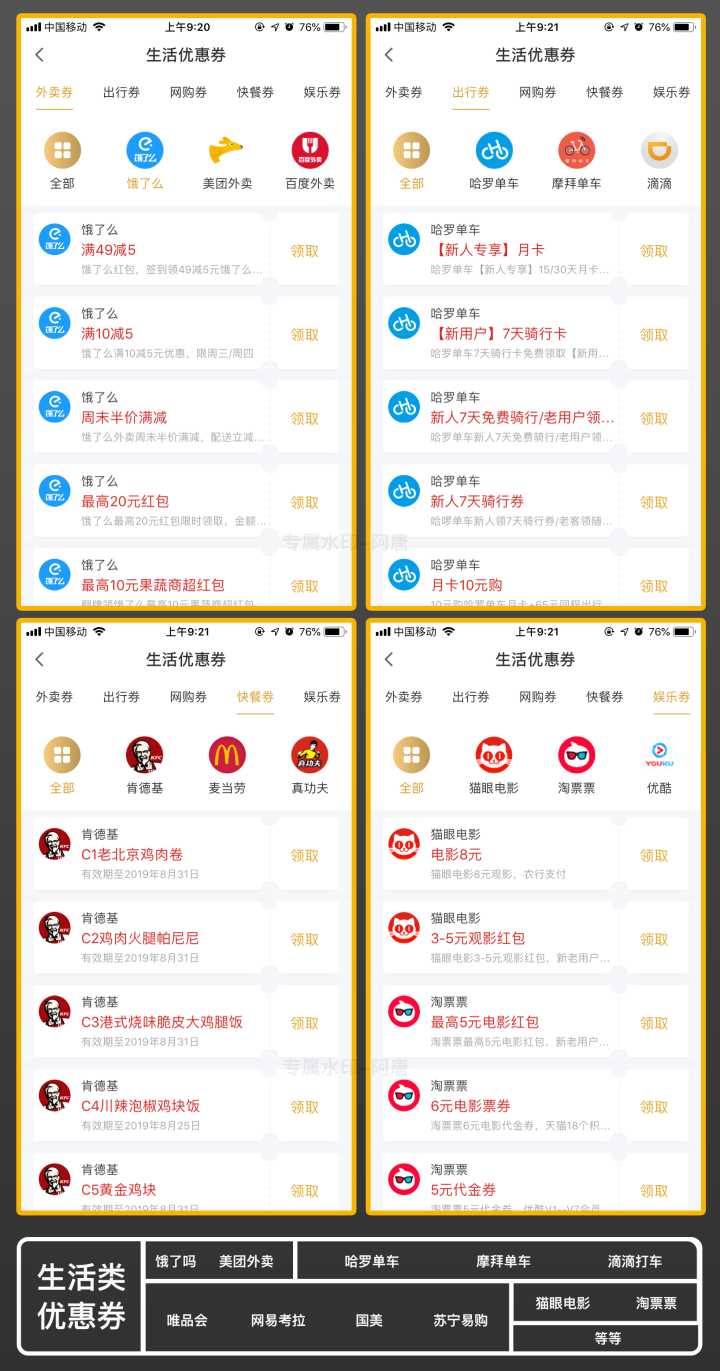 以上这些是平台的生活优惠劵,饿了么、美团、淘票票、优酷、爱奇艺等都可以领取优惠劵