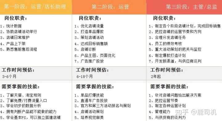 这是一张电商运营的基本发展路径图,从初级运营-中级运营-高级运营,列出了需要的技能与职责。