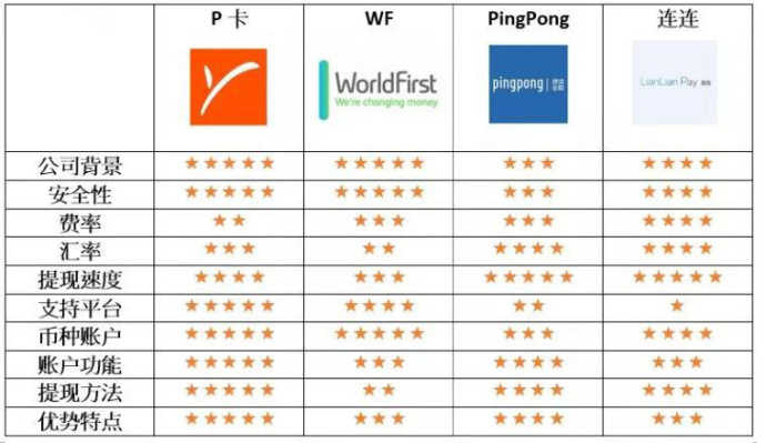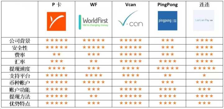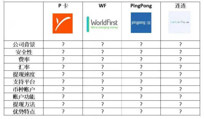 除了选择直接开通美国银行账号或香港银行账号外,目前市场上最常用的第三方收款公司是Payoneer(P卡),World First (WF),Vcan (汇创),PingPong 和连连,到底每家的优势在那,好像快点知道啊…