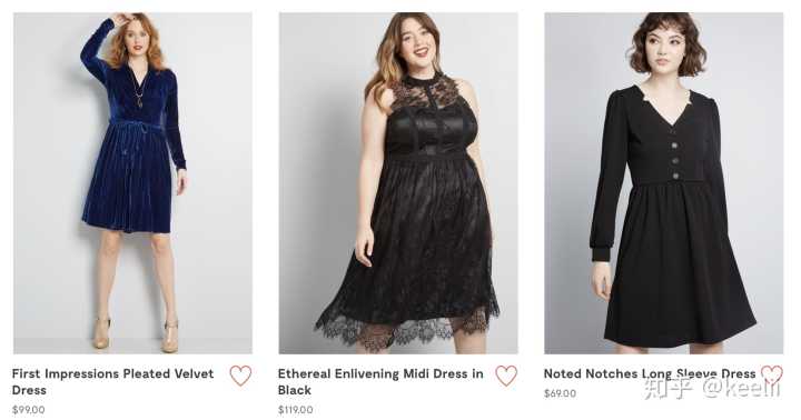 总体上给人的感觉是列表页非常清楚、简单。一眼扫过去就能知道衣服穿上的效果。而且图片中的人物也比较素雅普通,尤其 Modcloth 网站上,不同肤色、不同形体、不同风格会让你感觉到这就是平常人穿搭效果