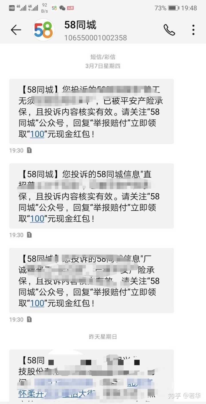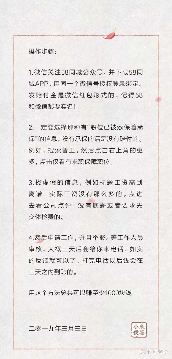 简单说一下,就是通过举报58上有些冒充厂家招人的中介和一些发布不实信息的厂家来获得保险赔付。既替58平台净化了信息,也赚到了钱呢。(知友给这个取了一个名字,叫“58打假”, )