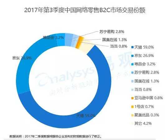 中国电子商务研究中心数据,以GMV计算,2017上半年中国B2C网络零售市场: