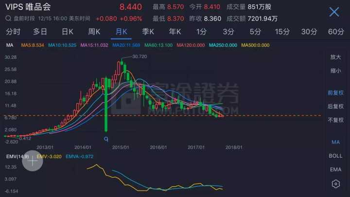 但唯品会这几年股价表现着实一般,唯品会自2015年3月股价触达30美元后一路走低,目前仅8.4美元,虽然实现盈利,市值也不过50亿美元,这就是在赢家通吃的互联网领域当“老三”的窘境。一旦增长回落,华尔街就会盯着利润不放。
