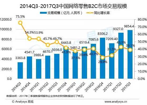 这几年,我国电商市场可谓蓬勃发展。据Analysys易观数据显示,2017年3第季度,中国网上零售B2C市场交易规模为9854.4亿元人民币,同比增长39.1%,较于14年翻了将近三倍!