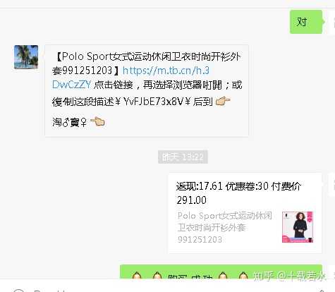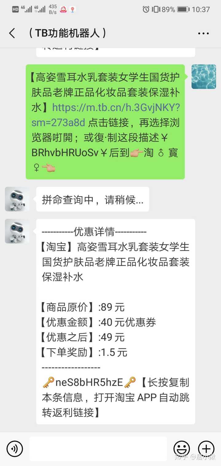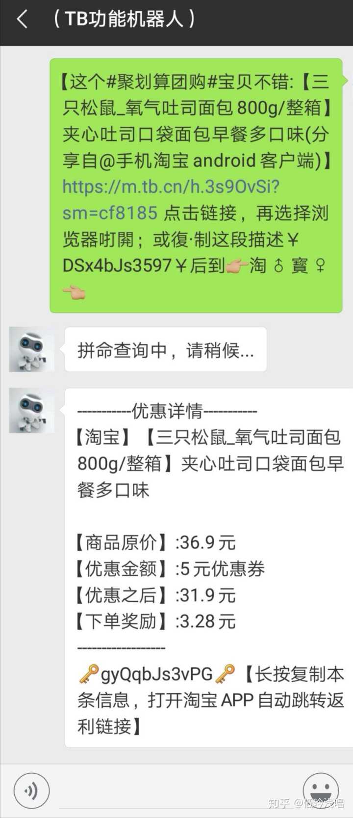 用户发送商品链接,自动返回领券链接并显示返利金额。用户完成下单并确认收货后,用户得到返利,运营者拿佣金。