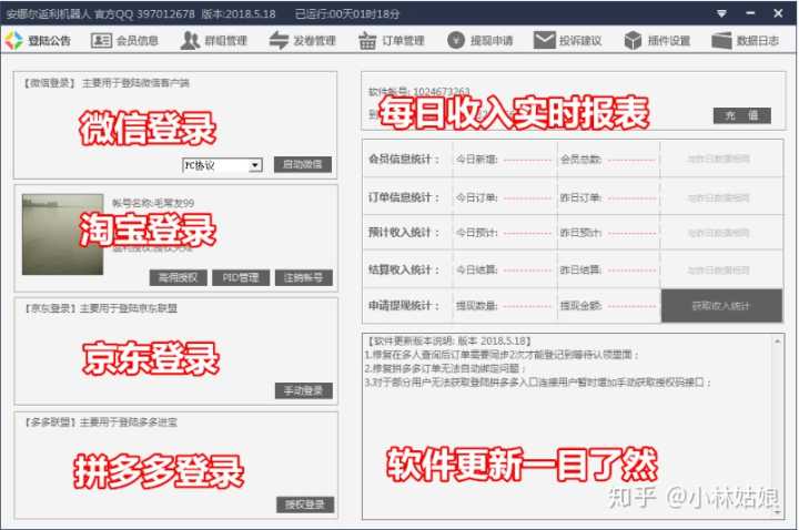 准备好以上三样之后,用软件登录绑定一个微信号,OK,那个微信号就是机器人了,可以实现自动查券,返利,提现等功能。