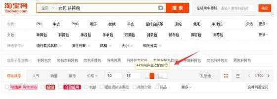 我们以女包中的斜跨包为例,筛选后的价格带是这样的:0-30 8%用户喜欢;30-76 44%用户喜欢;76-265 37%用户喜欢;265-8109%用户喜欢;810以上 2%用户喜欢 。这个是官方系统给出来的数据,你属于哪个价格区间就去再筛选一下价格带,这样又可以帮你筛选掉很多非真正的竞争对手!