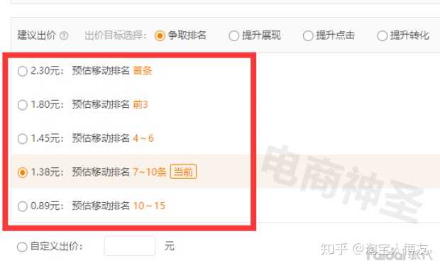 在我们选择关键词出价的时候,预估出价的移动排名。2.3元是可以到首条,那是没有包括溢价的。如果别人出价2.3元溢价50%,那你出3元都排不到首页。所以这里面就是看不到的数值,我们必须从能够承受的PPC去预估自己的出价和溢价,提高排名,提高单品转化率!