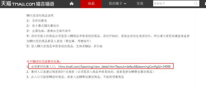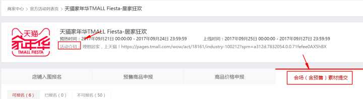 天猫店进入官方活动报名的窗口,公布页面、素材提交页面、活动说明页面