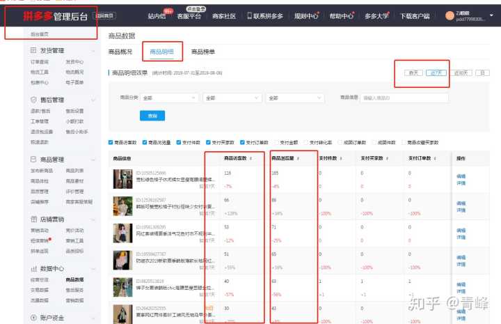 首先点击拼多多”管理后台“点击”商品数据“点击”商品明细“这个时候一定要点击近”7天的数据“因为新品上新流量考核一般都是以7天为一个分析参考,如图;
