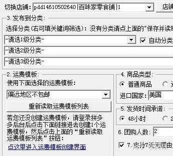 除了类目以外我们还需要选择拼多多店铺的运费模板,这个模板是需要你在拼多多后台实现设置好的,哪些地区包邮,哪些地区不包邮,续重多少等等。
