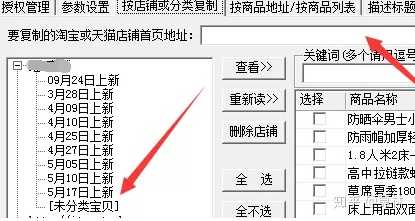 2、根据需要点击店铺名称下的分类,例如该同行店铺,我们选择他5月17日上新的商品,点击后软件就会自动把该分类下的商品全部抓取到右侧显示。
