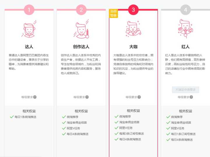 此外,淘宝根据淘宝达人拥有的粉丝数量,内容质量等因素,也进行了分级,不同等级的淘宝达人所能够给予的推广能力是有所区别的,所握有的渠道数量也会有所区别。
