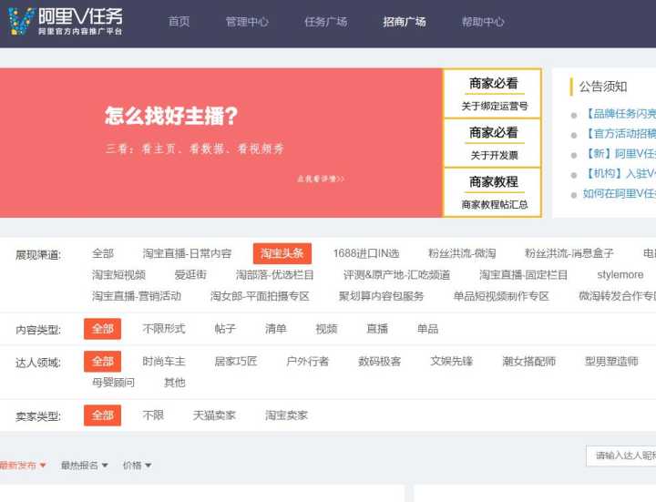里面有阿里V任务的,商家想要寻找淘宝达人推广产品,可以直接在阿里任务上开启任务就可以了!阿里妈妈后台好像也可以筛选的!