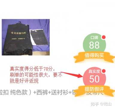 第一步,看一下这个商品的真实度得分,如果得分低于70分(真实度图标显示为红色),说明这个商品很可能有刷单或者好评返现: