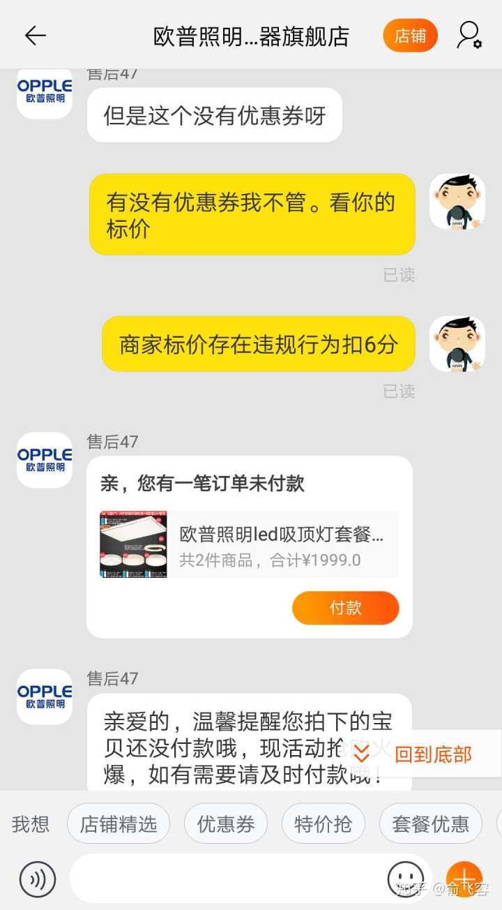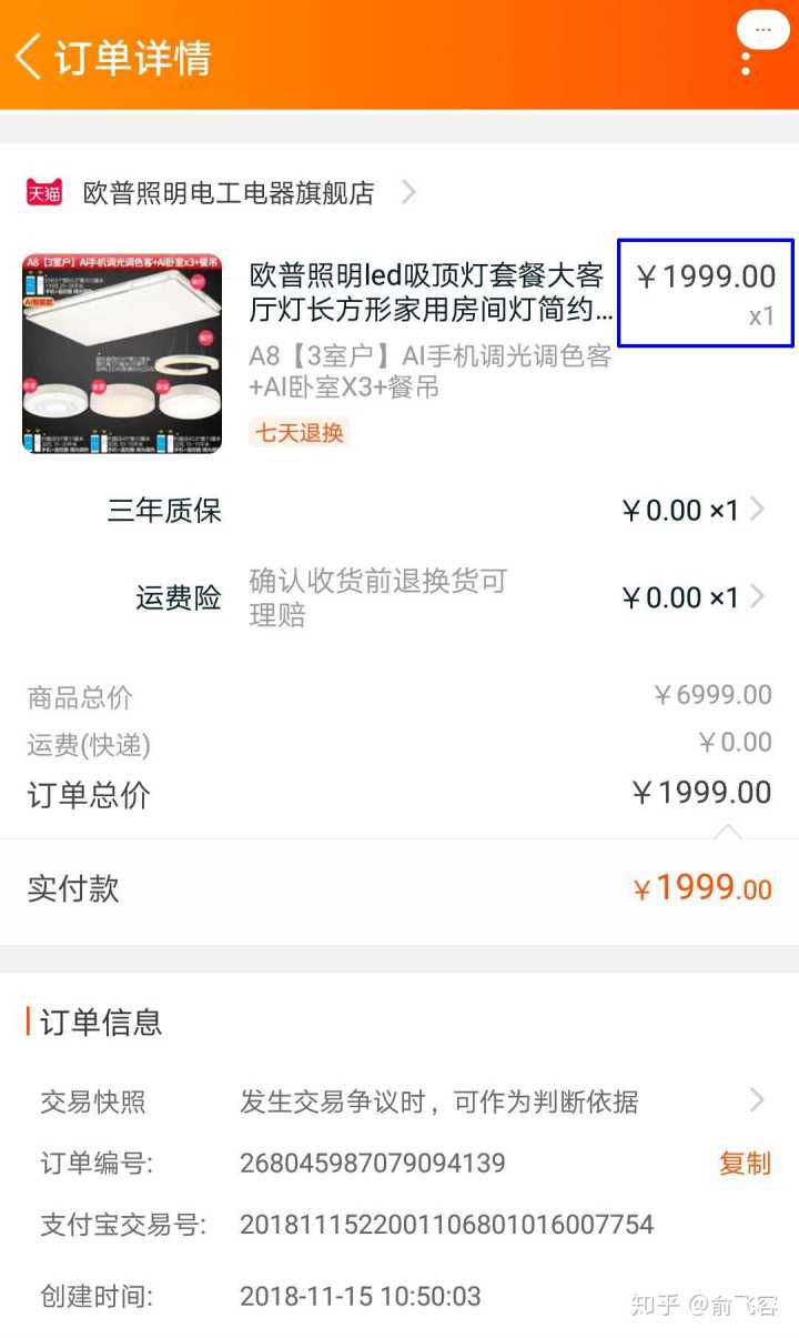 不过我早就料到卖家会来这一招。所以,再和卖家交涉之前,我就把1999的灯具拍下了,只不过没有付款。留下了交易快照。卖家改价了也没用。