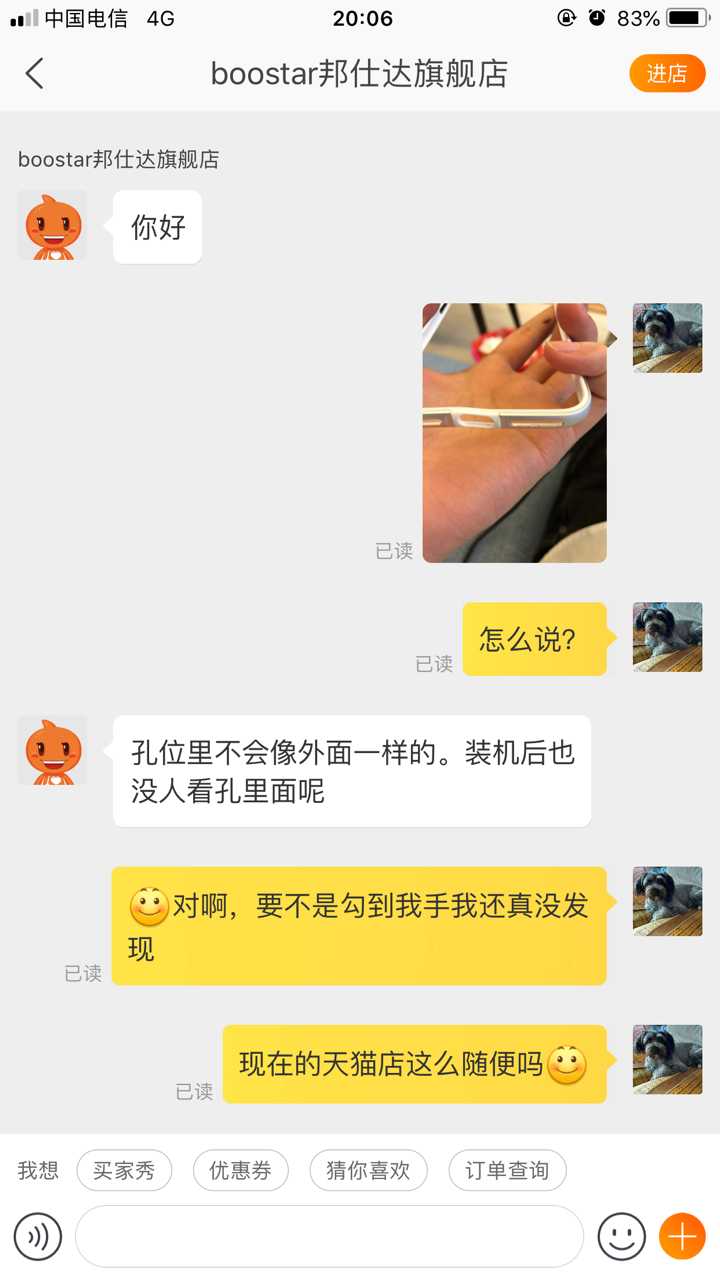 亲身经历,在天猫买了个手机壳,原本是挺高兴的,但是无意中发现扬声器位置的问题,很明显的质量问题,跟客服反应,居然说孔位不会像外面一样?!