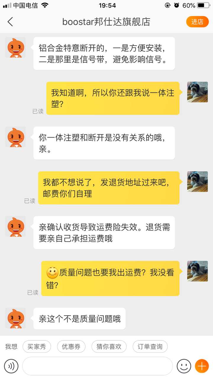 然后还说退货还要我出运费?!像我这种闲起来什么都做的出来的人,会忍得下这口气?