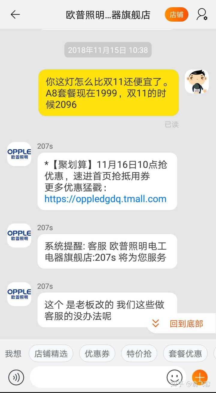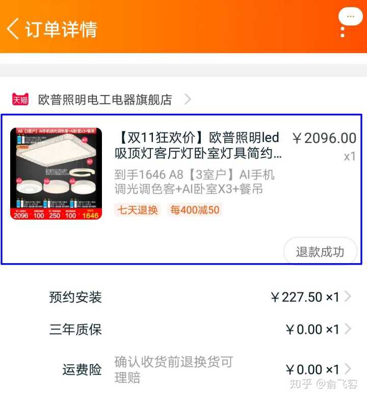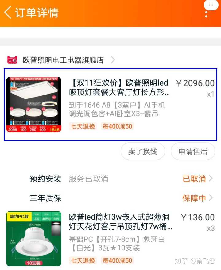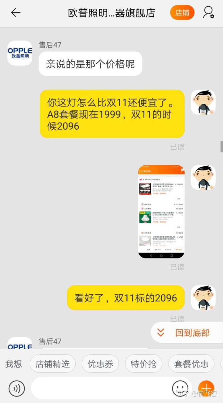 双十一的时候我在“欧普照明电工电器旗舰店”买了一套灯具。当时店铺有两款灯具我很喜欢。双11标价都是2096。当时我在这两款之间纠结了很久。开始买的第一套,后来又退款了,买了第二套