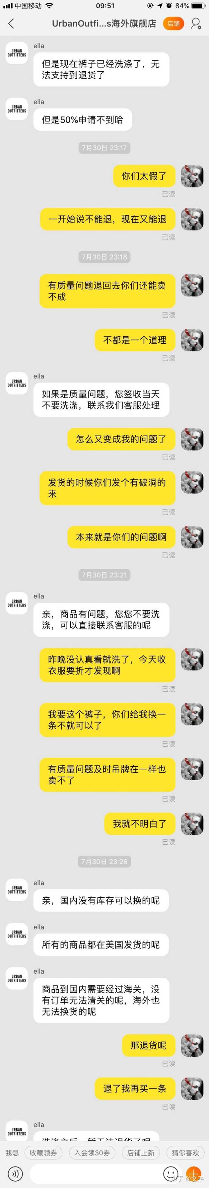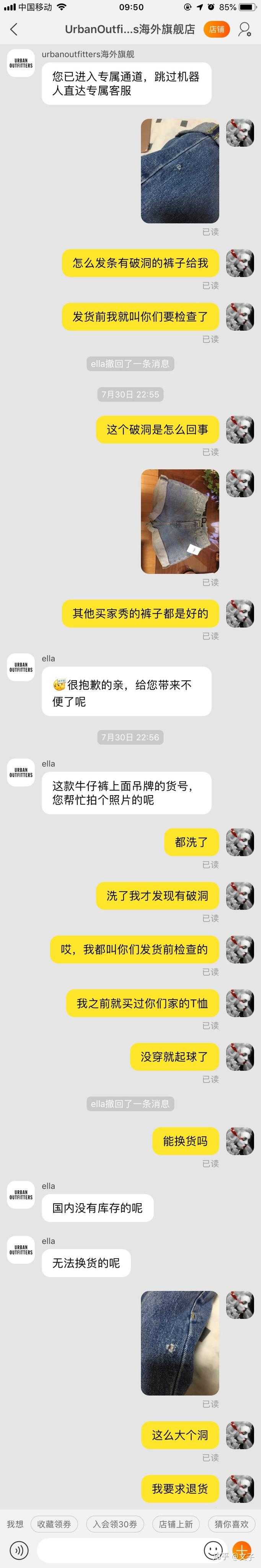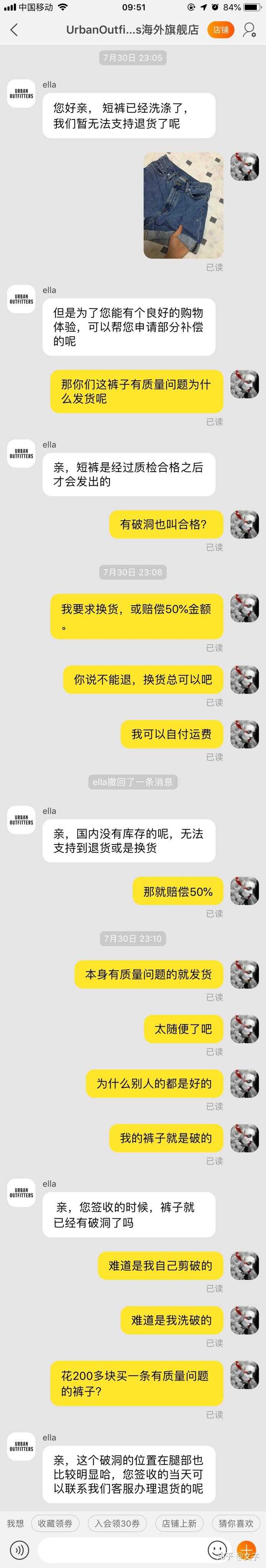 这条不完美的短裤配不上追求完美的我,淘宝要对我这条裤子负责。于是拍了照片发给客服,要求退换货。