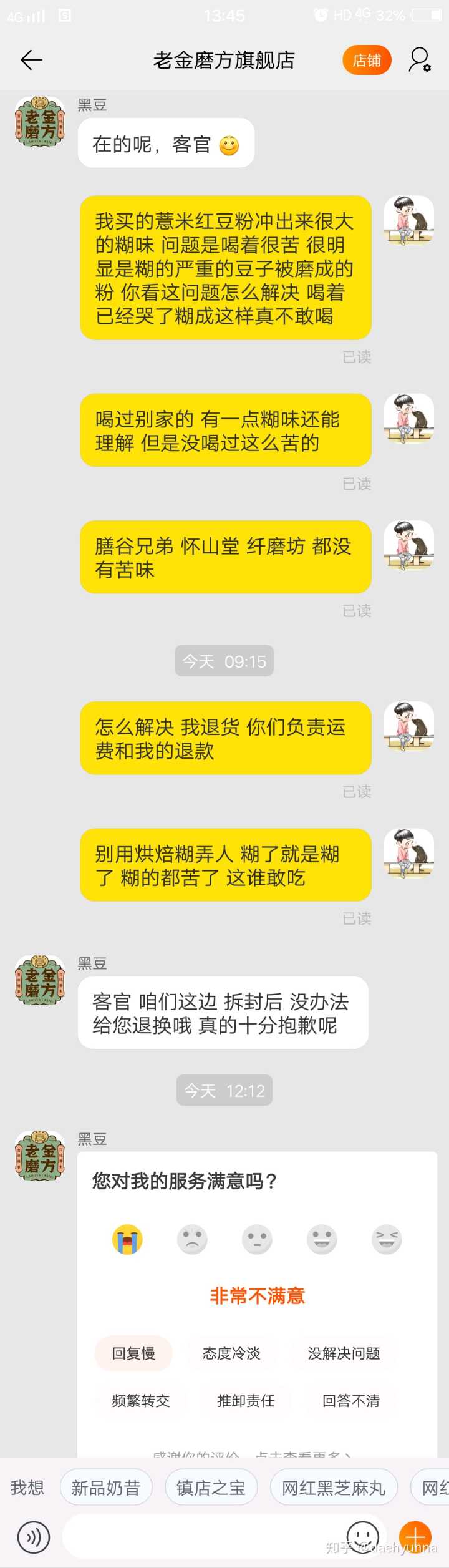 收到货打开以后,发现里面的粉有结块现象,这是我在之前三次购买没有遇到过的问题。随即用热水充了一勺粉,有非常明显的糊味,喝了一口特别苦。大家有常识的都知道,糊了的东西吃起来就是很苦。它这个味道和东西糊了的味道是一样的。红豆薏米粉虽然都是经过烘焙的,但是我在前三家买的就没有糊味,或者就像喝咖啡时那种手工烘焙的咖啡豆有一个轻微的糊香味儿,但是绝对不是糊到苦的那种。所以我认为他们家的产品质量有问题,一是受潮湿粉已经结块了,二是用糊了的豆子,甚至是糊的非常严重的豆子,打磨成粉,卖给买家。