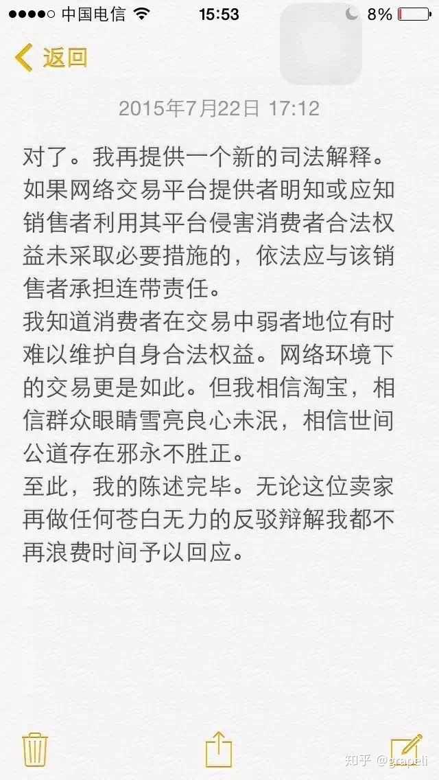 另外敢在网上怼淘宝,是受了老回的影响,老回通过坚持不懈的怼三星,终于把三星拉上了法庭,仅仅把三星拉上法庭,这也给了无数三星受害者看到了希望,虽不是三星受害者,但是看了老回的壮举,也有了勇气去怼淘宝,虽然不能像老回那样厉害,不过也愿意尽个人最大努力去发声和投诉,国内那群吸血的资本家就是该怼一怼了,披着再光良的外衣,撒再多糖,只要还再作恶,他们就需要被怼