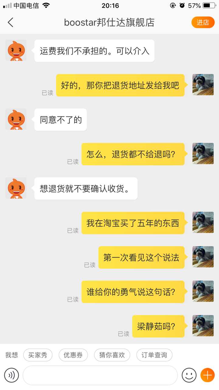 最可气的是,他还给我说了这个理由,真的是忍不住笑出声。后面我还特地去问了淘宝的客服 后面淘宝客服介入吧,成功拿到地址,下午寄了出去,虽然邮费是我出,不过有条短信过来说会有理赔,我就马上寄了出去哈哈哈如果有人关注的话我就继续更新,没有的话就到这了 。如果是产品真的有质量问题,大方去申请退货退款,邮费都不用自己出那种,有理就是大哈哈哈哈