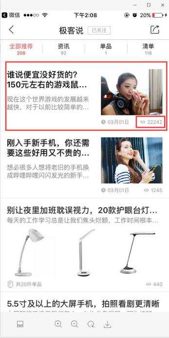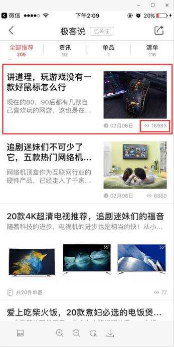 像极客说这样一个粉丝不到1300的达人号,每隔两天就有一篇爆文,在都有发现好货,好东西和清单权限的情况下,以发现资讯中的长文效果最佳,基本每篇爆文的阅读量都是万级为单位,数码类的进店率基本可以达到30%-50%,每天保证1-2篇,一个月下来通过长文曝光的量级就可以达到15-20万,进店UV就有5万~8万,保持1%的转化率,则带来的单量就相当可观,而且按照市场长文包月的预计30篇以上费用不超过1万元,而如果单纯靠站内开车,成本至少缩减3-4倍,关键达人的图文提供的是永久曝光,只要文章阅读点击的互动越来越高,就越会被系统推荐,之后可间接不断引入订单。