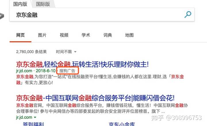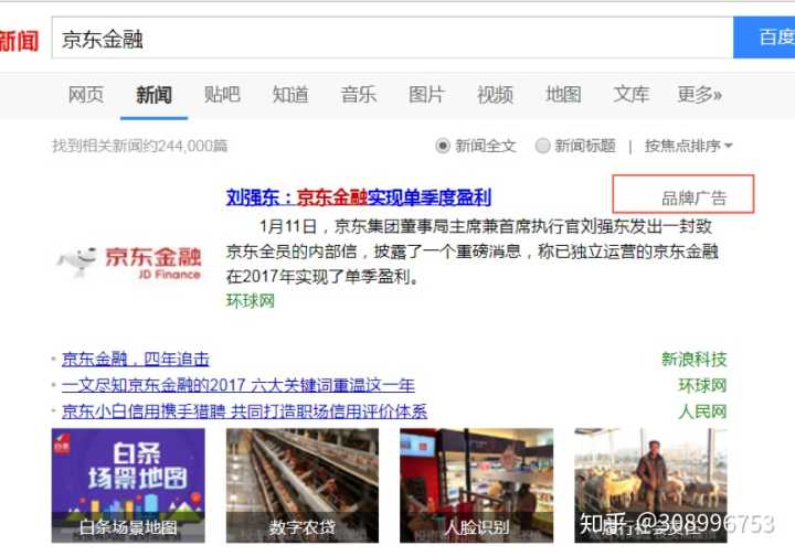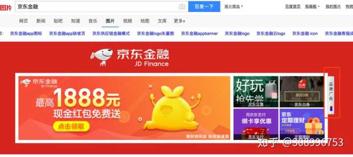 在不止一家搜索引擎里搜“京东金融”,先跳出来的是品牌广告,连搜图片也是广告。一些品牌广告点进去还是媒体报道,也许可能之前京东金融已经在媒体上投放了一轮软广了。搜其他公司出来的都是官方网站,或者相关新闻。