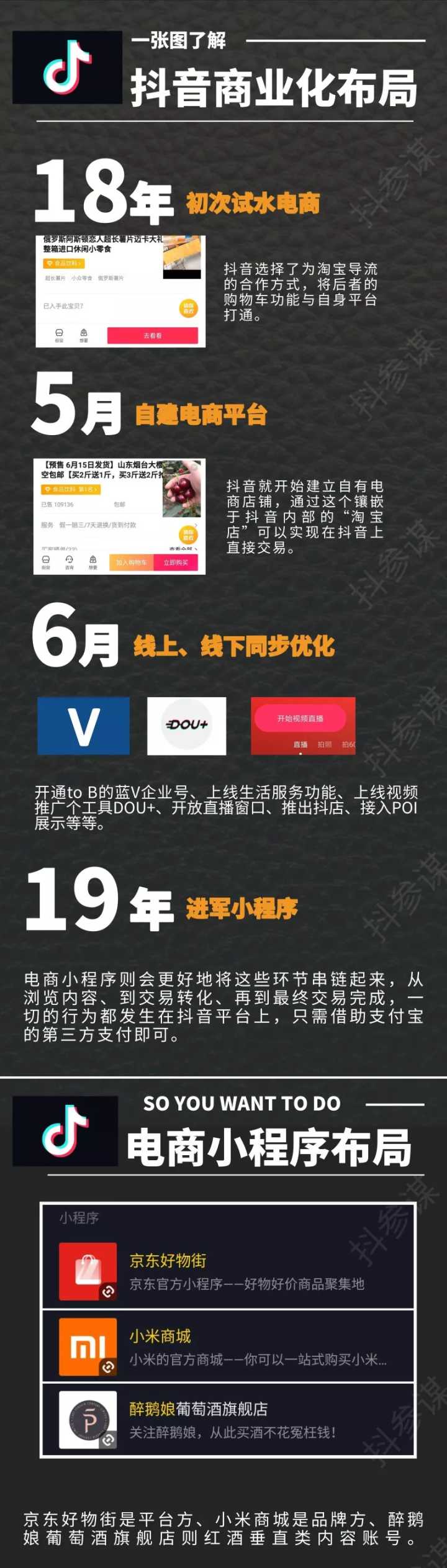 18年初,抖音就开始了电商战略布局,从引进淘宝,自建抖音小店,各大小程序加盟,再到今天的京东入住,无不展示着抖音进军电商的决心。