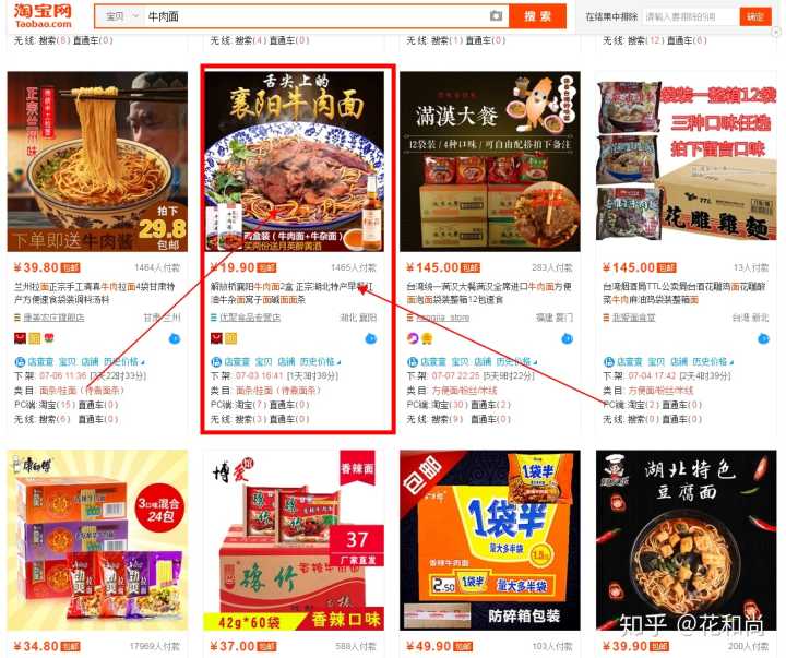 设身处地的设想一下,就比如说我们现在想要去买一个“牛肉面”,打开淘宝搜索“牛肉面”,看到以下产品,我们首先会选择点击哪个产品?