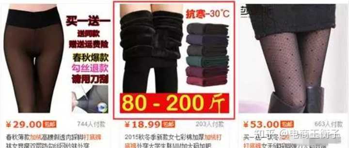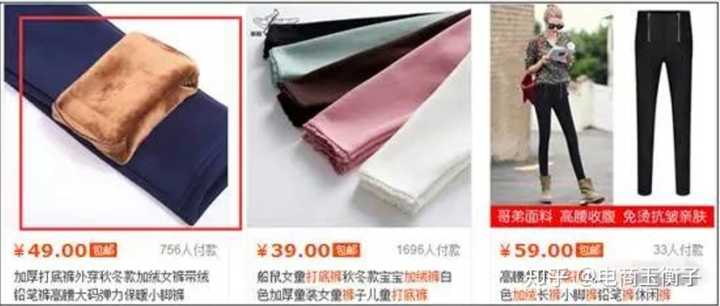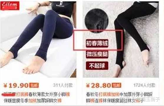 主要是产品的展现方式,比如同样卖一款弹力裤,在产品的展现上就出现了差异,左边只是展现了产品的款式,而右边通过高抬腿的动作有进一步展现了裤子的弹力好这一特点。