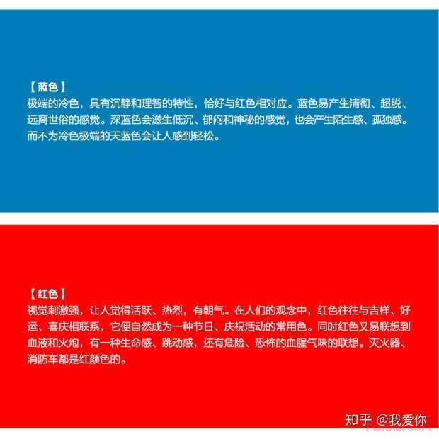 感受一下文字在红色背景和蓝色背景下的阅读体验,目光最先被红色吸引,但在红色背景上长时间阅读文字会让人焦虑、烦躁不安。