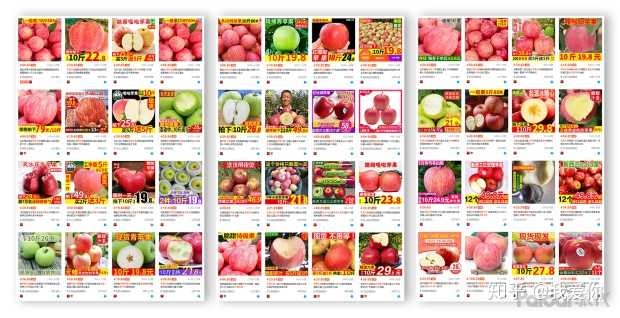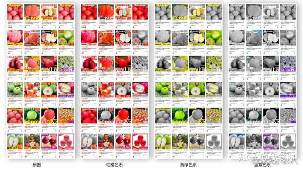 比如在“苹果水果”这个关键词下,我们按照红橙色系:洋红、红色、橙色;黄绿色系:黄色、绿色;蓝紫色系:蓝色、紫色,这三个色系分类进行拆解,如下图。