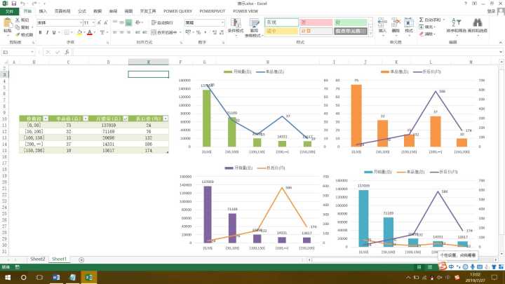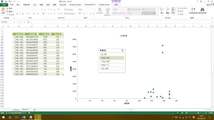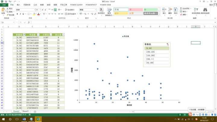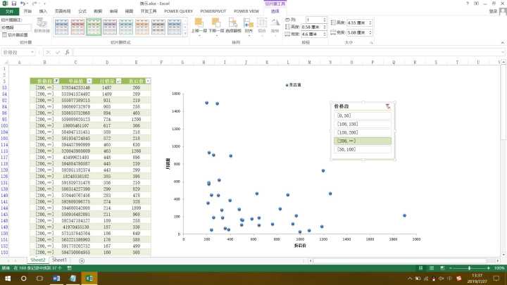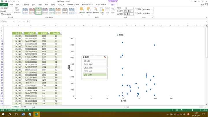 使用Summarize()函数自动生成数据透视表,重点分析【价格段】【单品值】【月销量】【折后价】这4个维度的表格数据,我采用二维散点图的形式进行透视,再结合【价格段】切片器,固定数据透视图大小之后,我们就可以根据不同价格段进行分析。