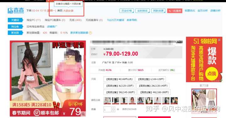 手淘搜索的流量其实就是商品的类目和标题,首先是类目,产品对应发布在什么类目,类目不要放错了,可以用一些免费的浏览器插件,查看同类产品都发布在什么类目,然后自己的产品也放到对应的类目就可以了,特别注意的是这里面有些商品适合放在好几个类目,比如下面的这一款商品,可以放在 女装女士精品>大码女装 也可以放在 女装女士精品>毛针织衫 放在哪个类目都可以,都不是错误的,但是要符合自己的店铺定位和产品的定位,如果店铺专注于做大码女装,那就放到大码女装,如果是专注做风格女装,那就放到毛针织衫。