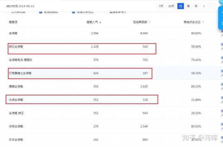 如果你产品的竞争度符合,再看一下商城点击占比,它代表品类竞争的难易程度。占比多代表天猫多,天猫多的,市场和竞争就更大。