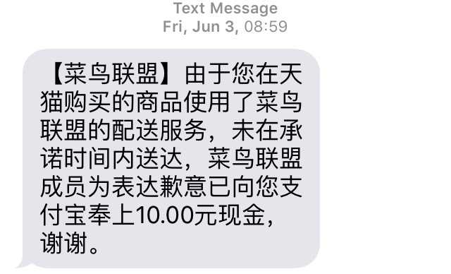 第一天晚上12点在天猫超市下的单,第二天下大雨,于是第三天早上到货。菜鸟联盟居然因此主动退了十块钱。然而我并没有要求它一定第二天送达。就冲这责任感,相信它走得远。