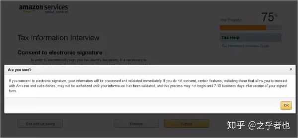 如果上一步你选择是第二种方式,系统会出现下图这个一个提醒,告知你如果你同意提供电子签名,那你的信息会立刻生效,如果你不同意提供电子签名,那么只有在收到你邮寄的表格后7-20个工作日,你的信息才会生效。所以再次提醒大家,如果非必须,不建议用mail的方式发送表格。