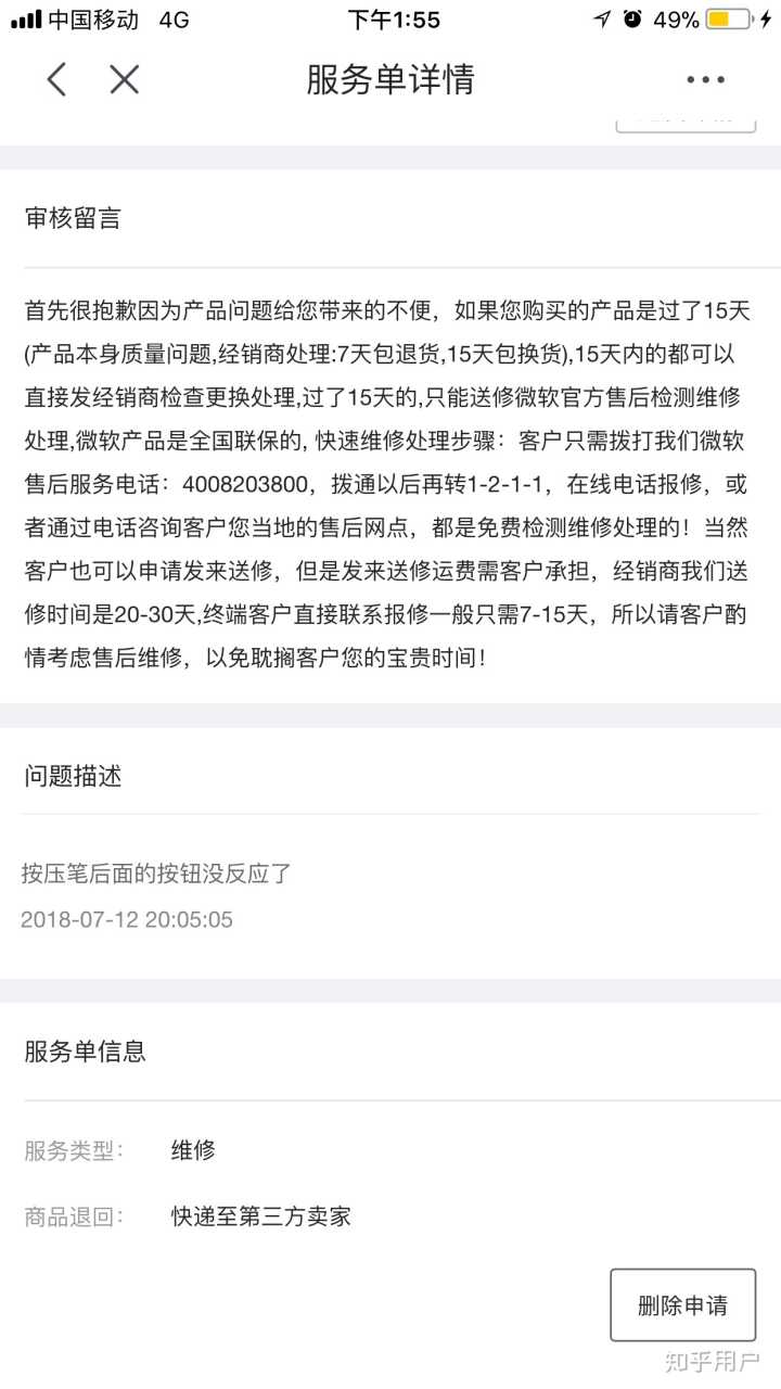 在我的使用中,我又发现笔后面的笔擦按钮经常失灵,我又一次申请维修,这一次,商家是这样说的,如图6,7