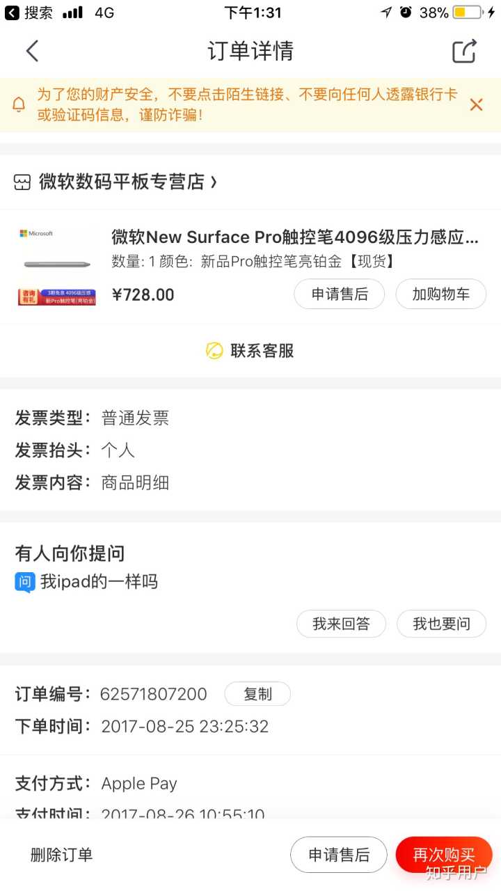 在17年的8月份我在京东上买了一支surface pen ,并且跟商家备注了要发票,如图1