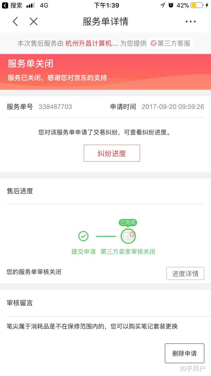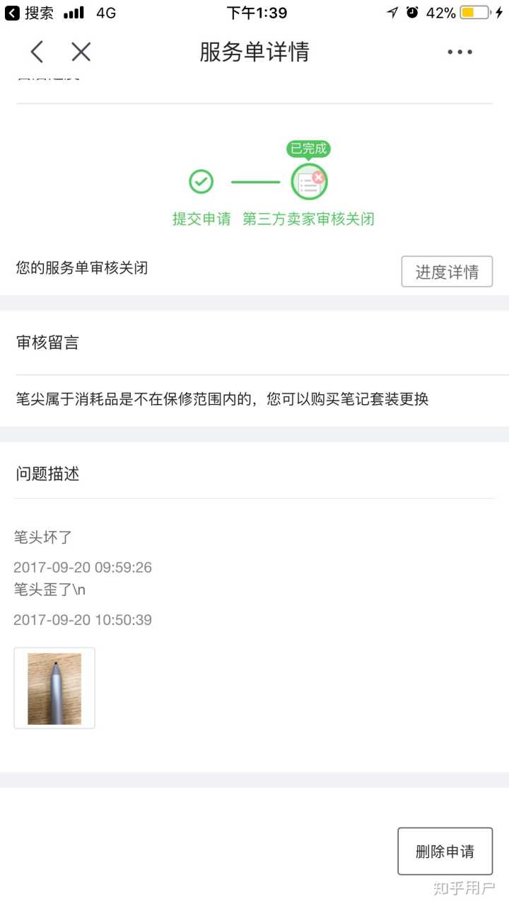 商家拒绝退货,我嫌麻烦也就没管了,谁知道买来不久以后笔头写歪了,我申请维修,商家又拒绝了,看看这次的理由,如图4,5,无奈之下,我只好自己去买了笔头包,自己换了笔头