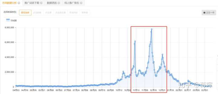 因为T恤类目的波动不是很明显,我另外找了羽绒服类目,大家应该可以看出这个波动差距应该更加明显,分别集中在11月初、12月初、1月上半旬。