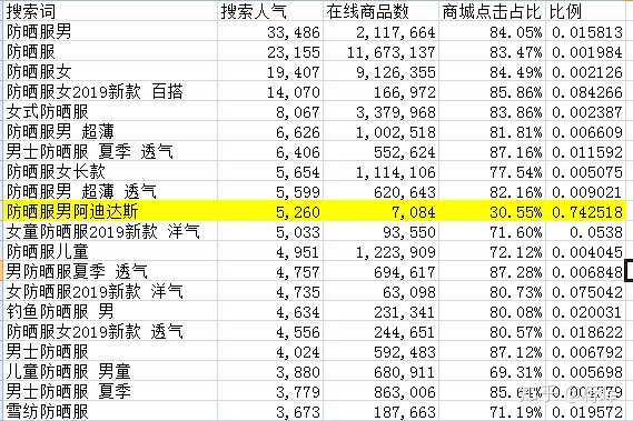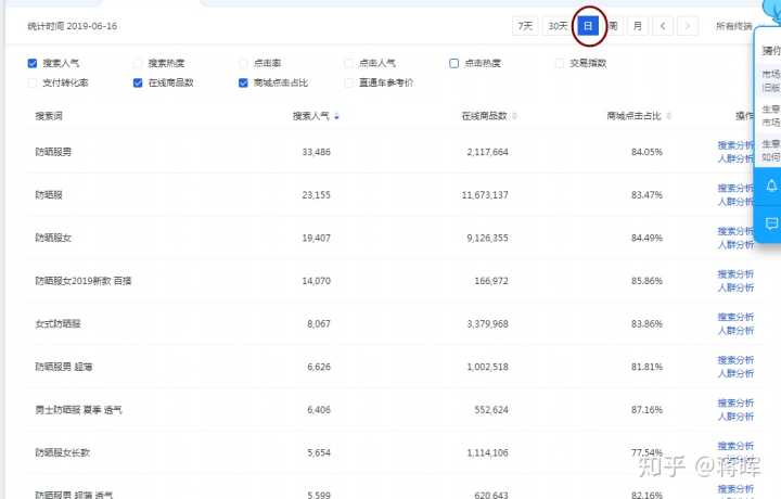 这需要借助到生意参谋,比如你想卖防晒服,通过“生意参谋-市场-搜索分析”,输入“防晒服”,然后按照搜索排名,注意这里是一天的数据。(会更加精准)