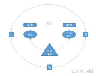 买家和卖家,买家有需求(人),卖家有产品(货)。在某个场景里彼此交换价值(场)。