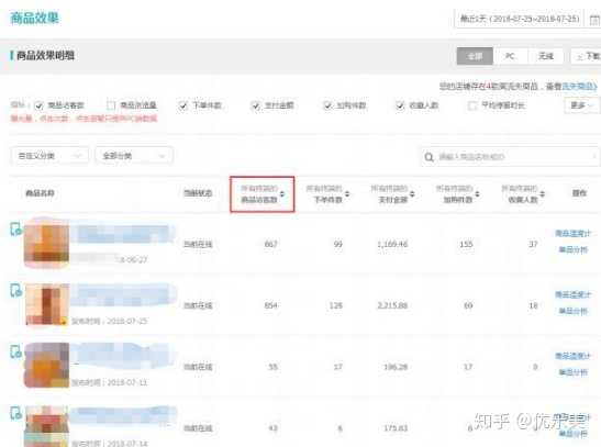 如果说你的店铺原来是有产品的,那么这种情况下你要看一下这些产品的访客情况。打开生意参谋——商品——商铺效果,查看一下这边的数据。如下图: