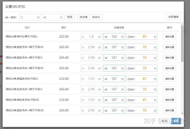 但这样价格跨度稍大的宝贝SKU设置,总是会遇到各种各样的问题,比如SKU打折困难、发布宝贝时提示价格不对等等。淘宝官方还对宝贝类目价格、区间价格等有各种限制,让各位店主空有力气使不出来。实际上,巧妙运用SKU打折功能就能很好地解决这些问题,甚至还有额外的效果。今天就跟大家说一说SKU打折有哪些使用小技巧: