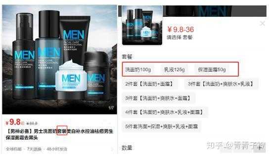 该商品的标题和主轮播图显示的是套装售卖,但SKU中却售卖洗面奶、乳液、面霜等单品。