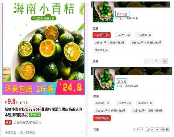 如下面这一小青桔,标题中最小规格为1斤,但SKU中最小规格是200g;标题中的最低价9.8元是200g的价格,而实际1斤装需要14.8元。